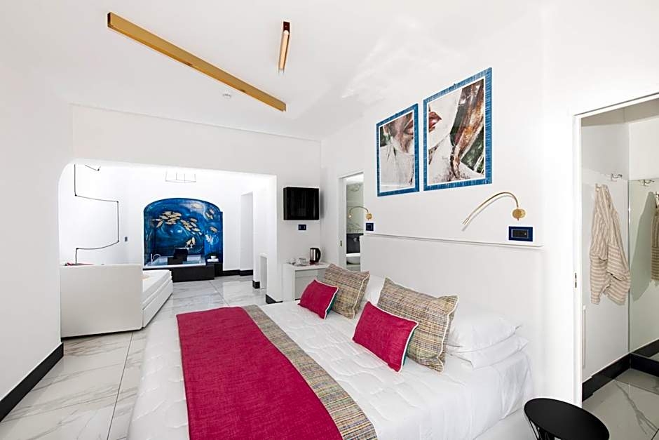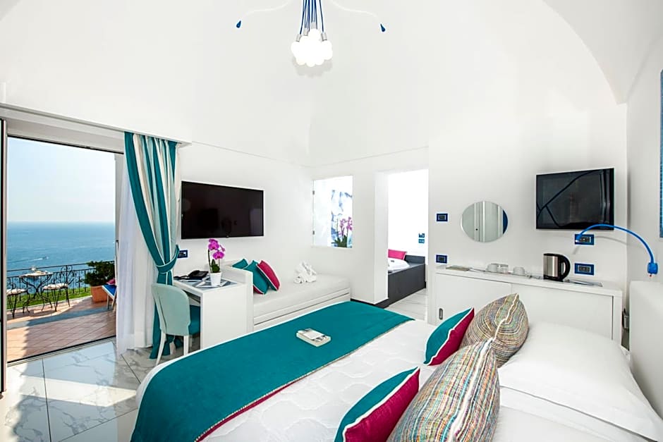 Large room with a seating area and balcony with sea view. Features a spa bath in the bathroom. Some have a hot tub in the bedroom instead. Also has a 26" LCD TV and free Wi-Fi.